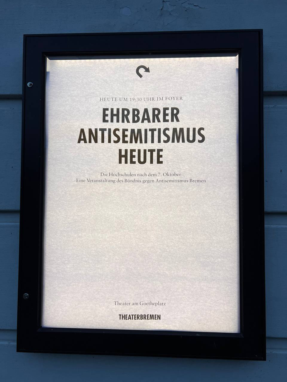 Am 16.10.2024 organisierten wir ein Podiumsgespräch im Foyer des Theater Bremen mit dem Philosophen Michael Heidemann, Andreas Stahl von der Beratungsstelle gegen Antisemitismus an Hochschulen in NRW und Mark Rozanov vom Verband Jüdischer Studierender Nord.