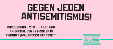 Kundgebung mit Redebeiträgen am 27. Januar 2025 um 19 Uhr. Solarium – Kommunistische Gruppe Bremen mit: Bündnis gegen Antisemitismus Bremen, Bündnis gegen Antisemitismus und Antizionismus Oldenburg und Junges Forum DIG Bremen.